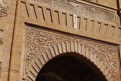 Mudejar is defined by the systematic use of brick for walls and of pottery and wooden framework for roofs, as well as rich decorative repertoires of Muslim origin on Christian structural forms, such as lobed arches, rhomboidal designs, bow ornamentation or the use of tiles.